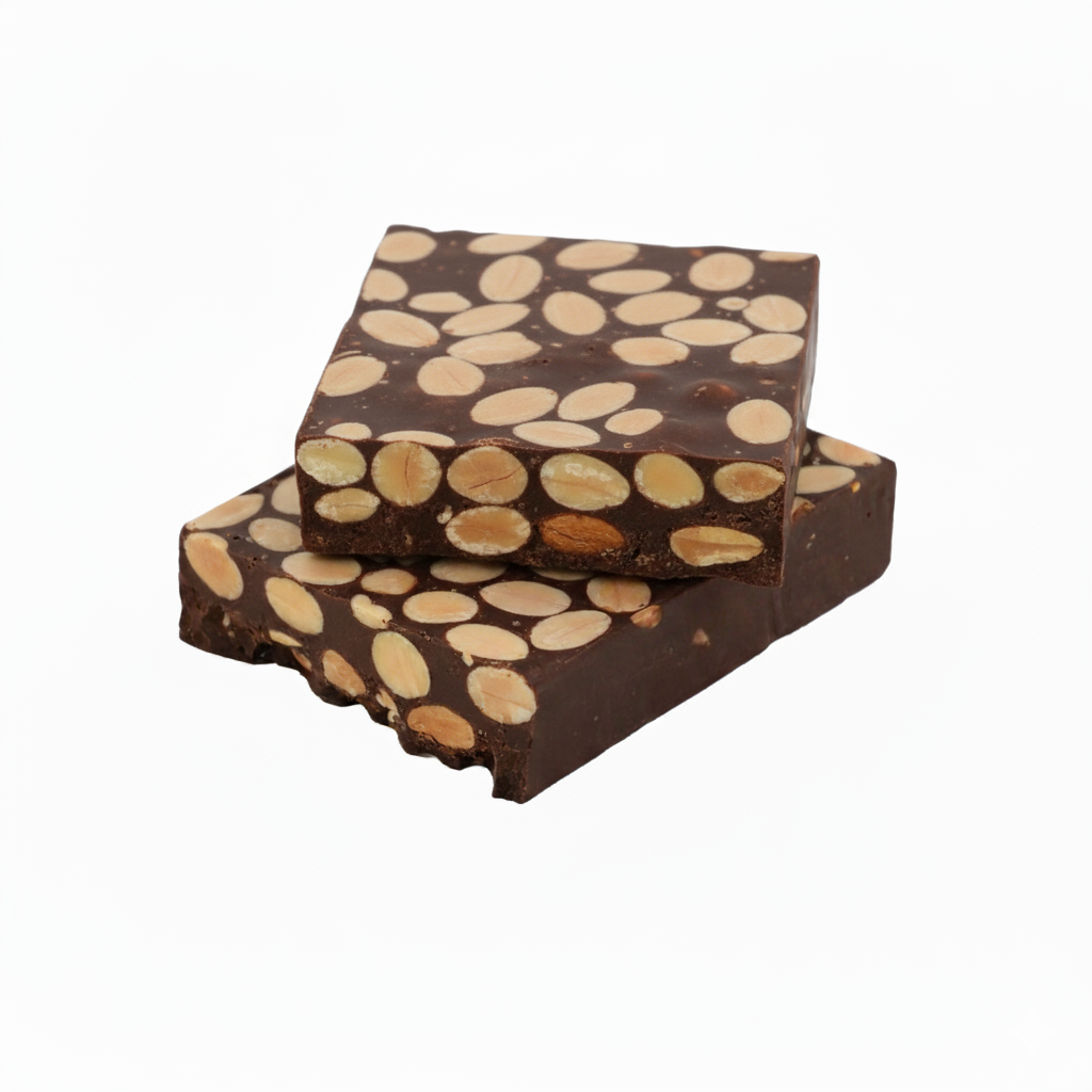 Su receta combina almendras marconas cuidadosamente seleccionadas (40 %) con pasta de cacao y un contenido mínimo de 33 % de cacao. El resultado es un contraste perfecto: la intensidad del chocolate negro con la textura crujiente y la suavidad de la almendra, una mezcla capaz de conquistar a cualquier paladar.